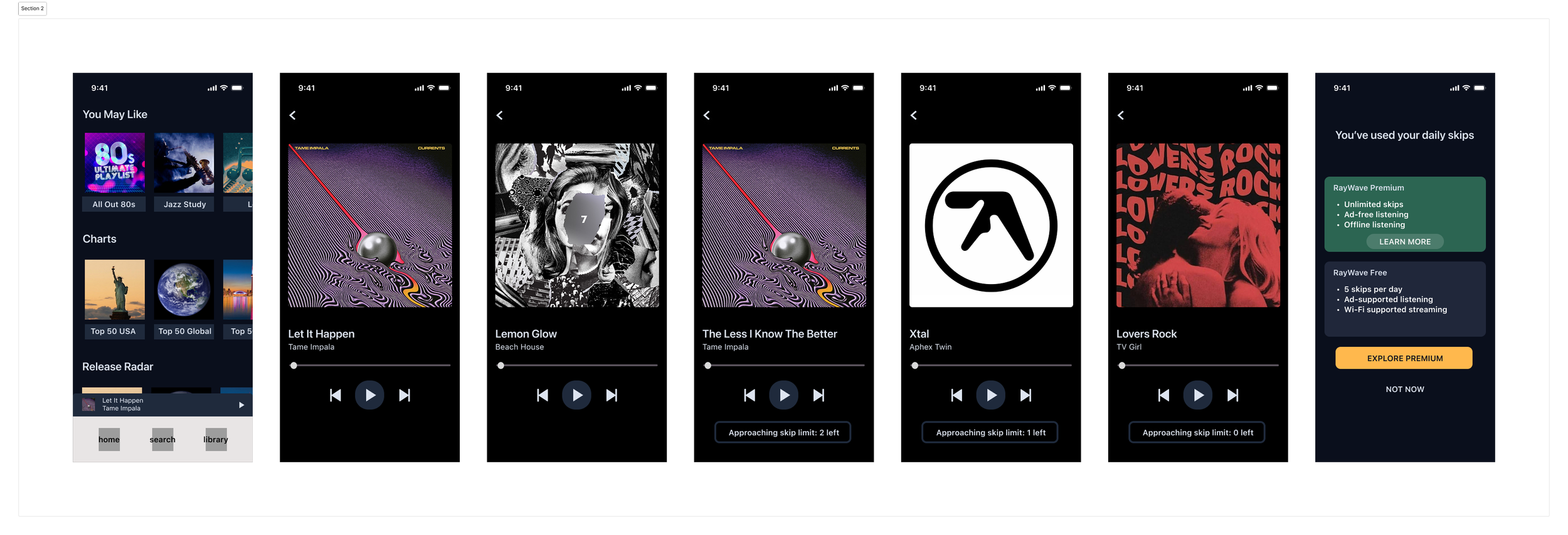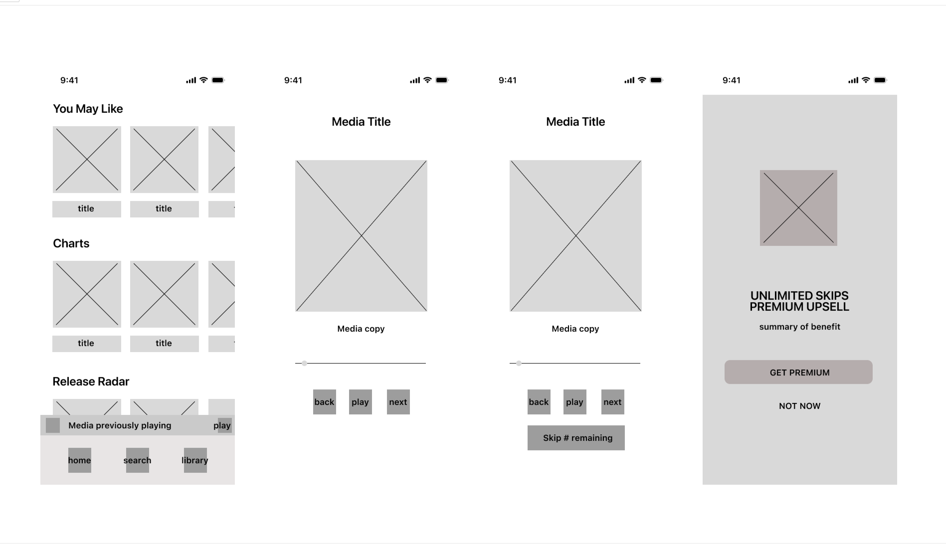 Wireframes focus on structure, information hierarchy, CTA placement, and non-disruptive premium triggers.