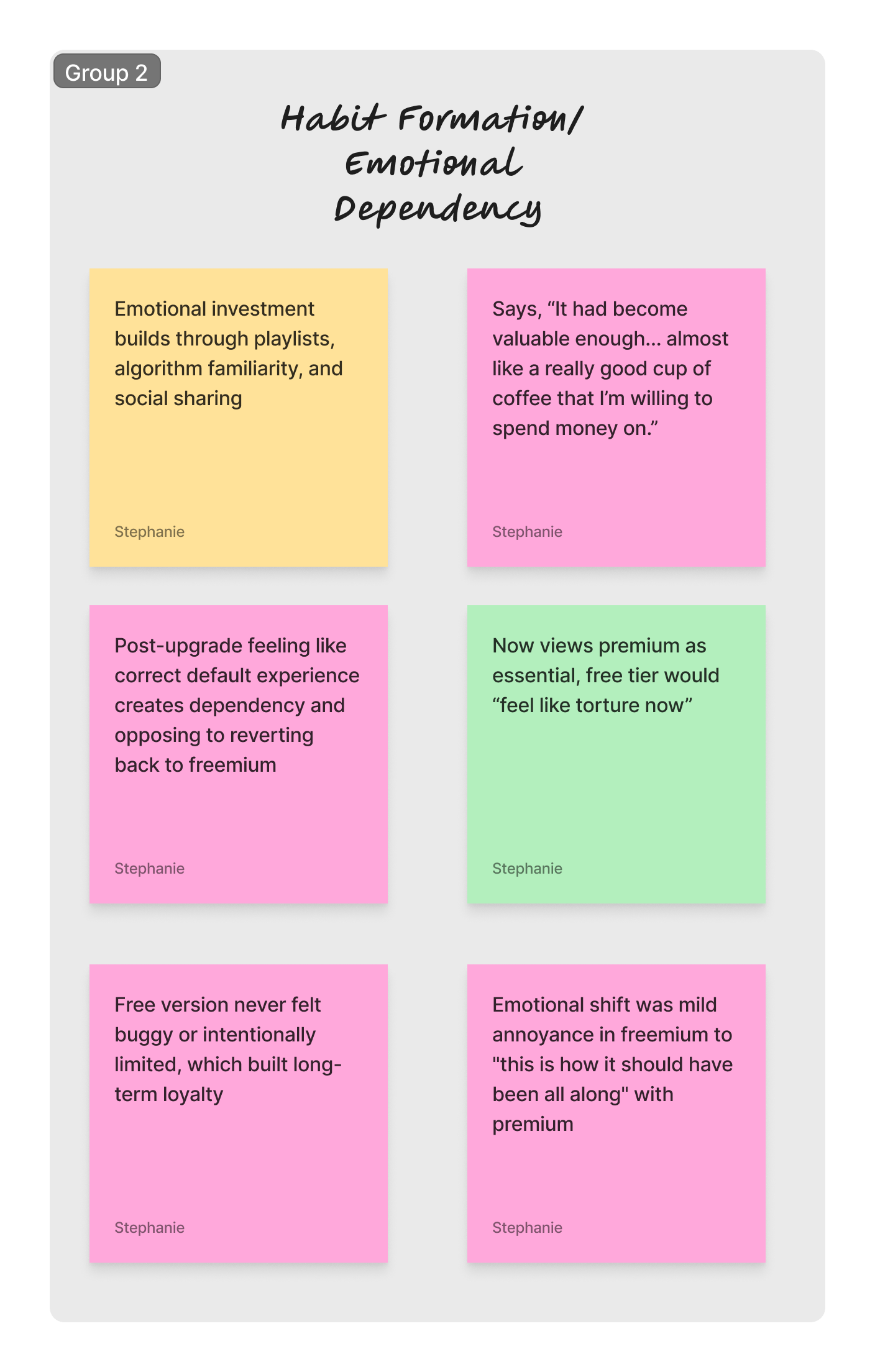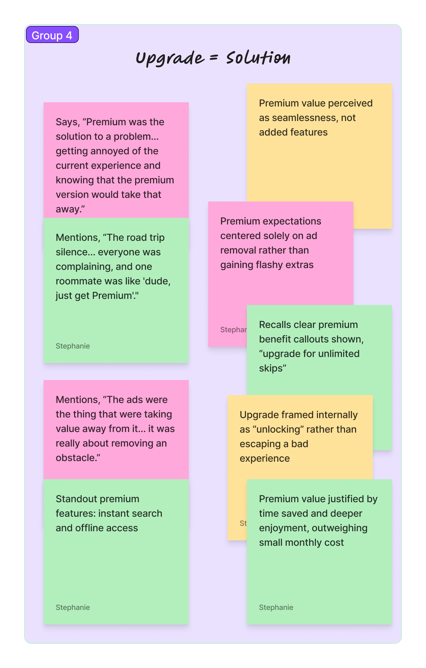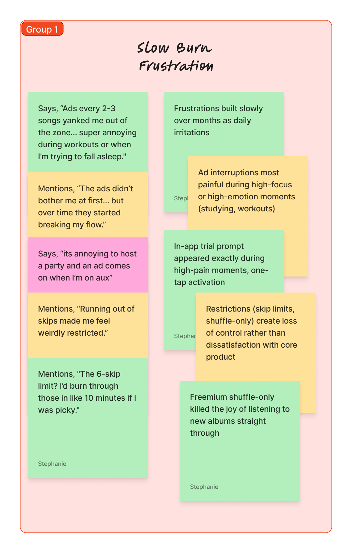 I grouped insights into themes using affinity mapping; identifying shared behaviors, frustrations, and opportunities.